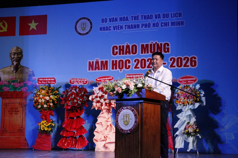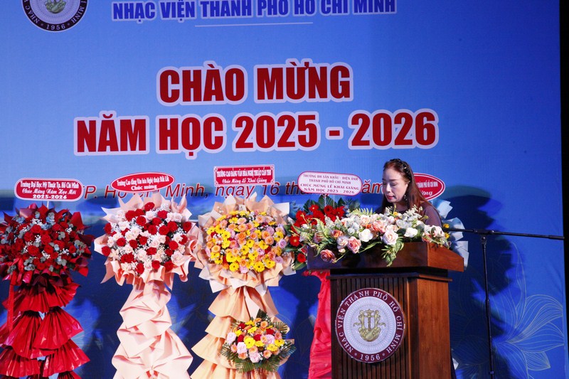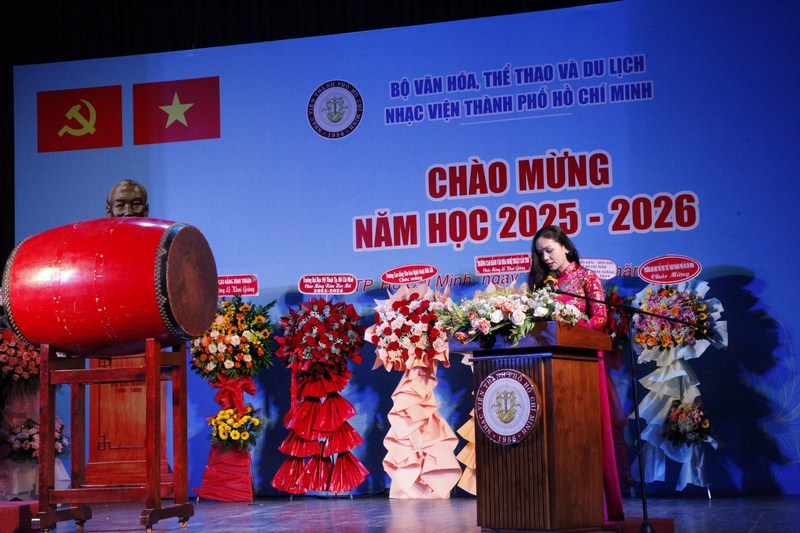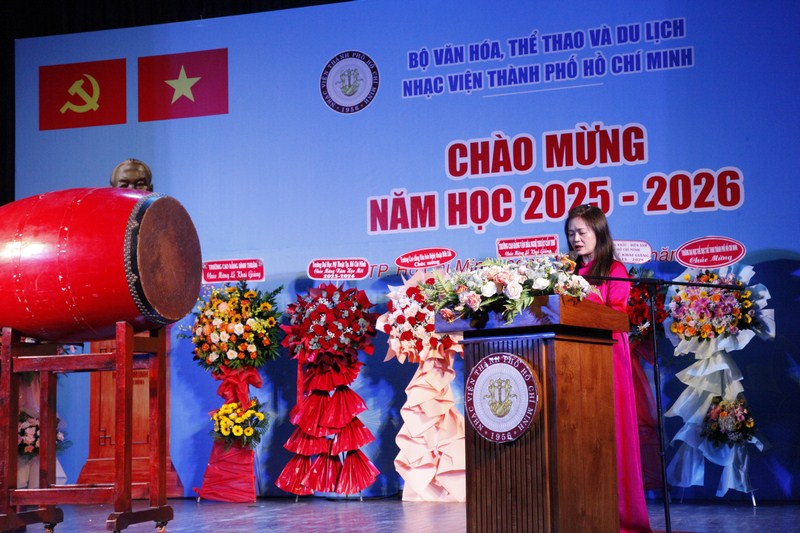 Thay mặt Ban lãnh đạo nhà trường, ThS. Huỳnh Thị Thu Hiền đọc Thư chúc mừng năm học 2025-2026 của Bộ trưởng Bộ Văn hóa, Thể thao và Du lịch Nguyễn Văn Hùng gửi ngành giáo dục. TS. Nguyễn Mỹ Hạnh – Phó Bí thư Đảng ủy, Q.Giám đốc Nhạc viện TP. Hồ Chí Minh đọc diễn văn chào mừng NH 2025-2026 và điểm qua một số các thành quả đạt được của nhà trường trong năm học 2024-2025, đồng thời gióng hồi trống khai trường chào mừng năm học mới, 2025-2026 tại Nhạc viện TP. Hồ Chí Minh.