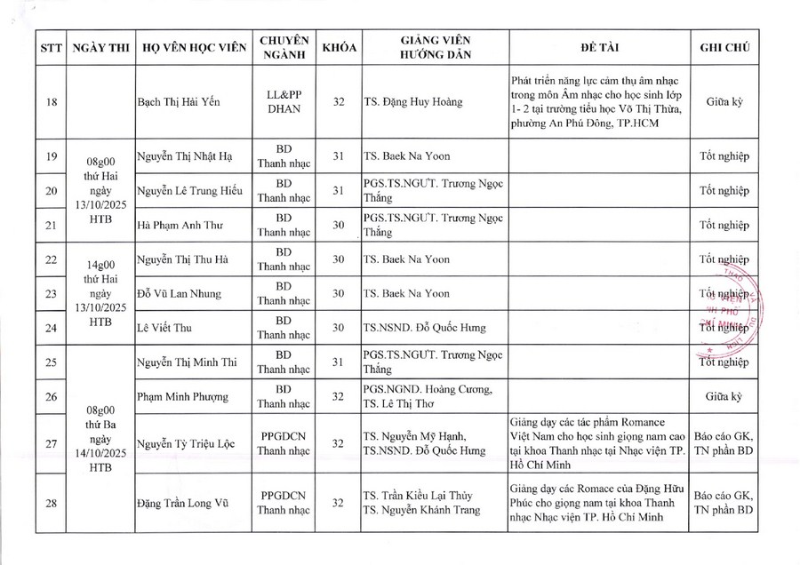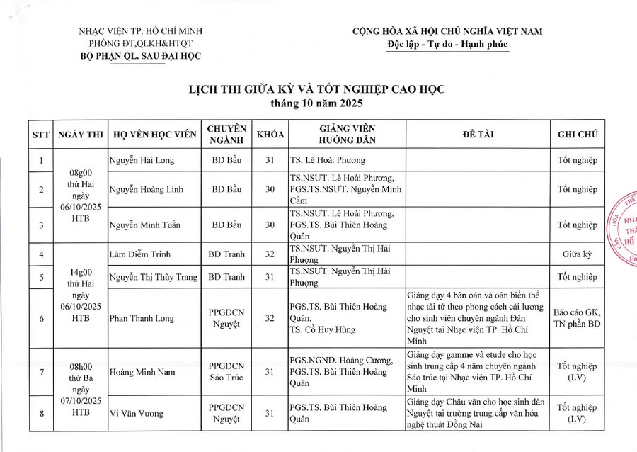Lịch thi giữa kỳ và tốt nghiệp Cao học - tháng 10/2025