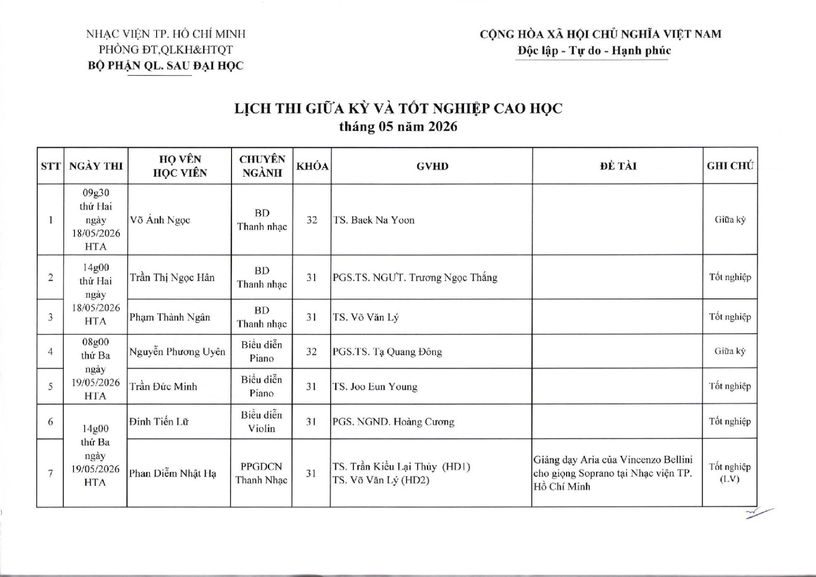 Lịch thi giữa kỳ và tốt nghiệp Cao học - tháng 5/2026