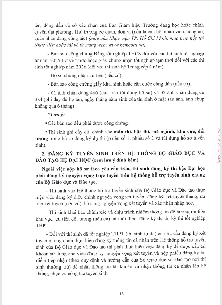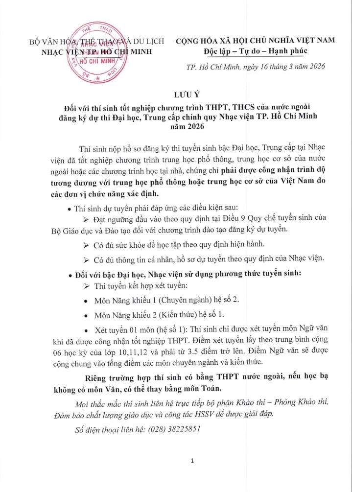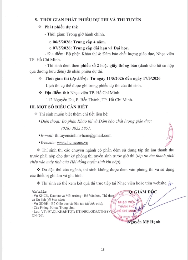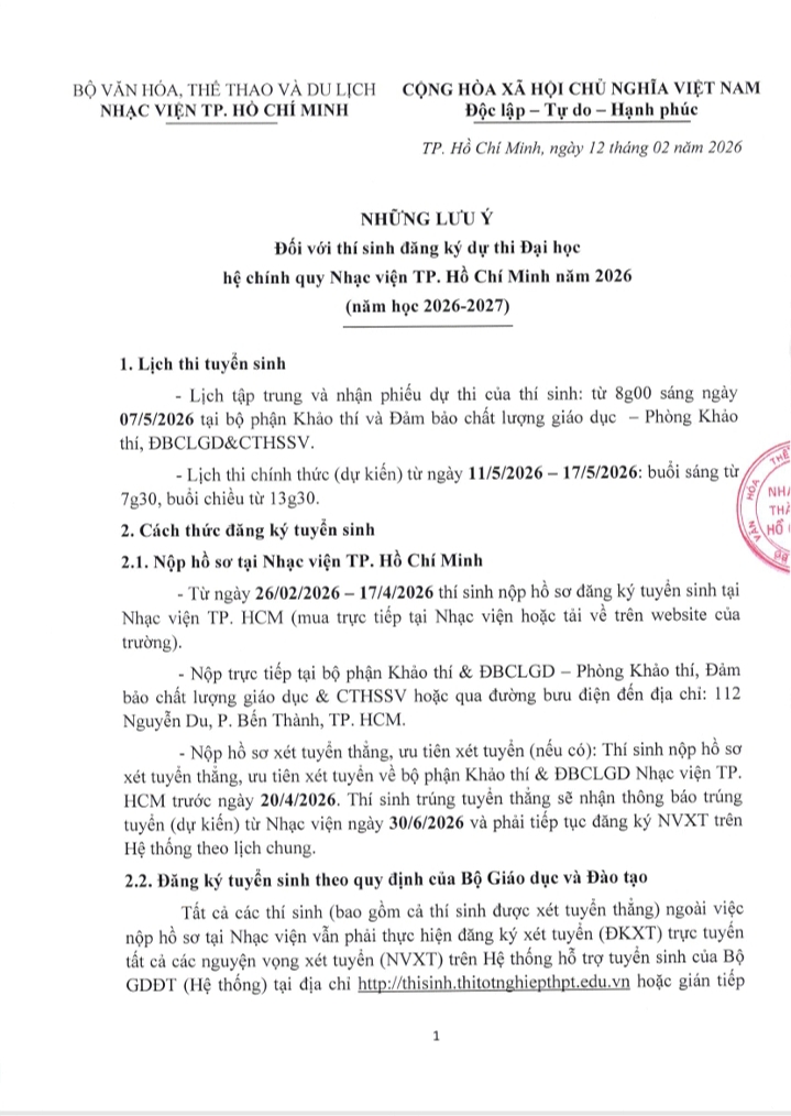 Thông báo Tuyển sinh Trung cấp và Đại học hệ chính quy Nhạc viện TP. Hồ Chí Minh NH 2026-2027 và Những lưu ý khi đăng ký dự thi Đại học hệ chính quy