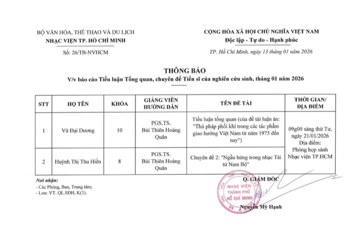 Thông báo V/v Báo cáo tiểu luận tổng quan, chuyên đề Tiến sĩ - tháng 01/2026
