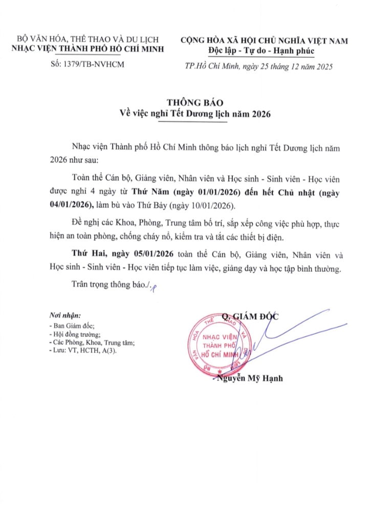 Thông báo về việc nghỉ Tết Dương lịch 2026