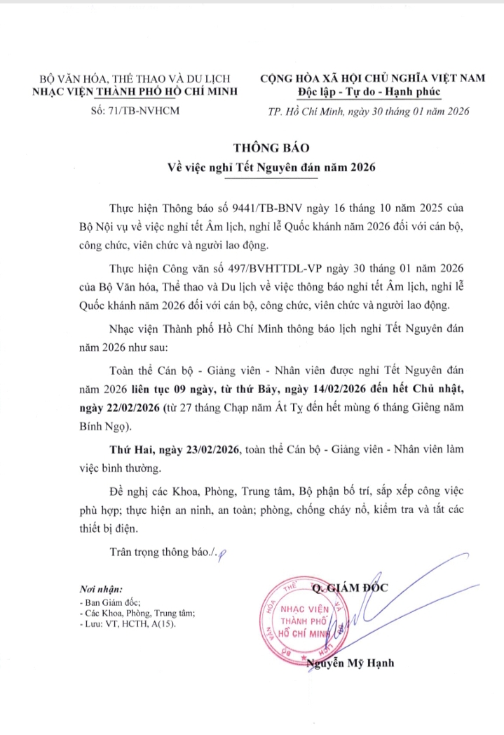 Thông báo về việc nghỉ Tết Nguyên đán năm 2026